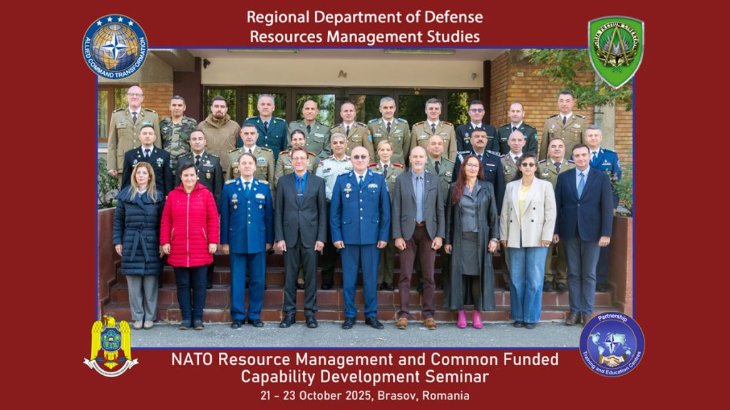 În perioada 21-23 octombrie 2025, Departmentul Regional de Studii pentru Managementul Resurselor de Apărare a primit vizita unor experți NATO (Subject Matter Experts/SMEs) care au susținut seminarul „Managementul resurselor NATO și dezvoltarea capabilităților cu finanțare comună” în cadrul cursului postuniversitare de formare şi dezvoltare profesională „Managementul Resurselor de Apărare pentru Personalul de Conducere” – ACT.678.18.