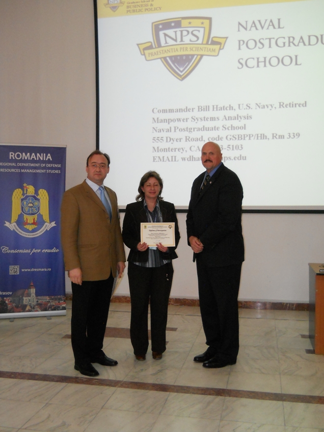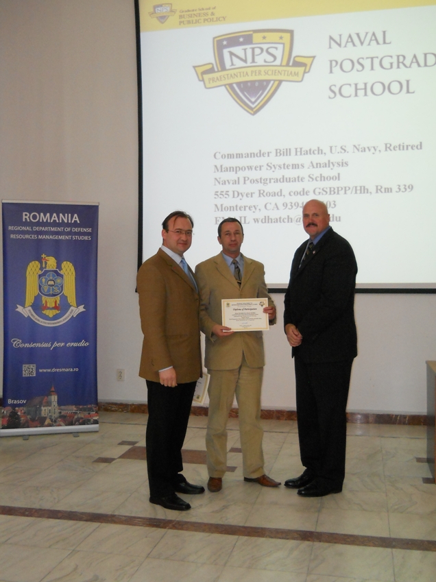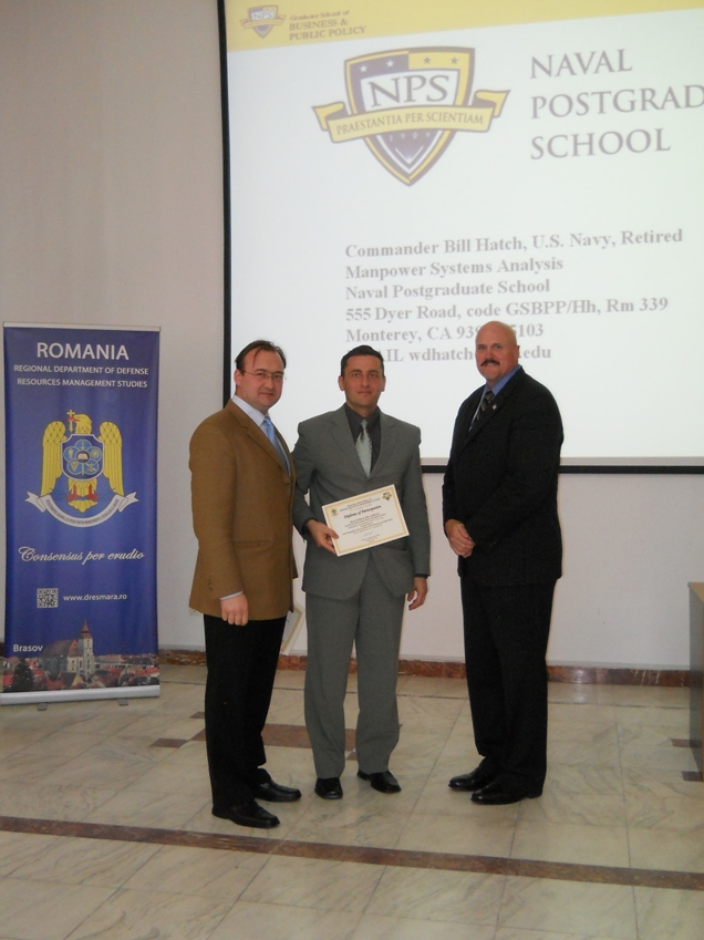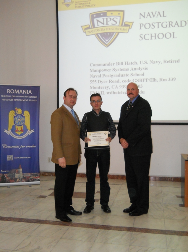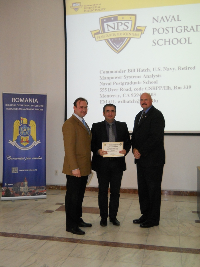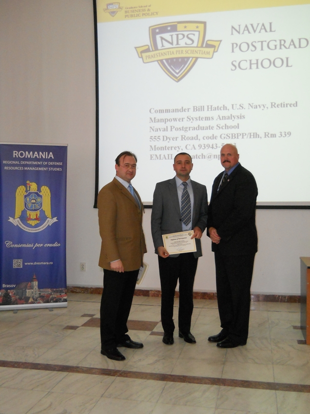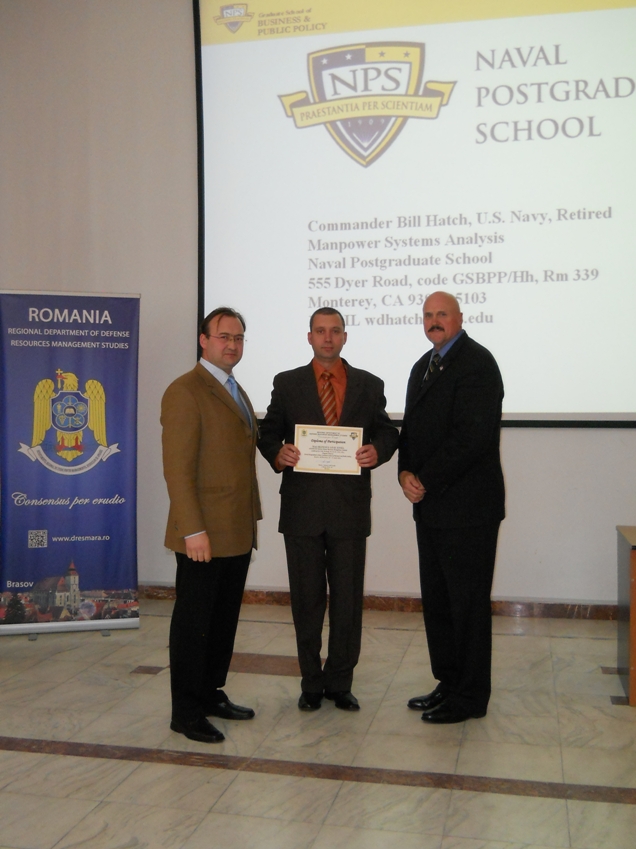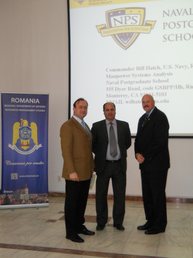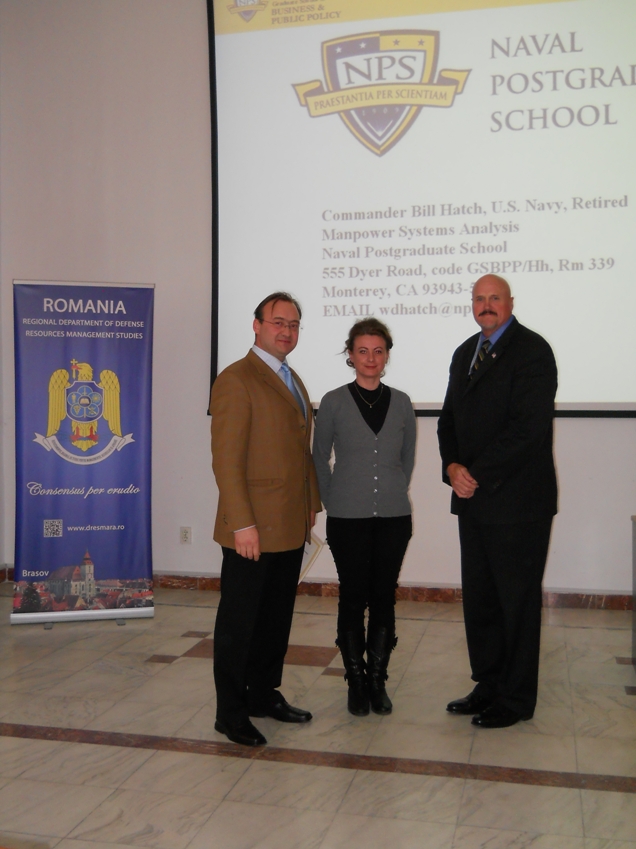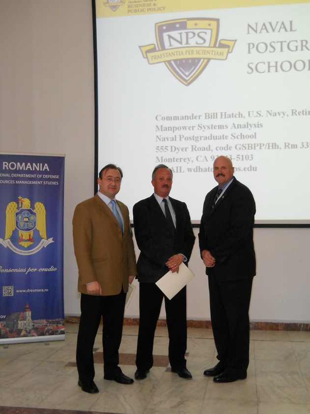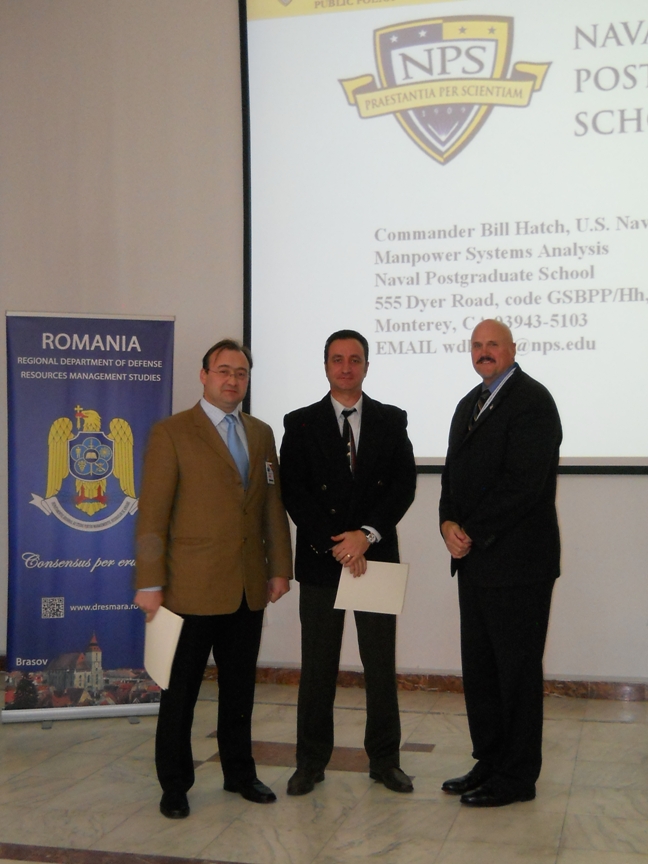 În perioada 10-12 aprilie 2013, DRESMARA a organizat în colaborare cu Şcoala Universitară de Afaceri şi Administraţie din cadrul Şcolii Navale de Studii Postuniversitare (NPS) de la Monterey – Statele Unite ale Americii seminarul „Managementul resurselor umane în domeniul apărării”. Seminarul a fost susţinut de domnul Comandor (r) William HATCH, director de programe educaţionale la NPS. La activitate au participat ofiţerii - studenţi de la cursul postuniversitar de perfecţionare „Managementul resurselor de apărare pentru specialişti”, personalul didactic al departamentului, experţi în domeniul managementului resurselor umane din cadrul categoriilor de forţe ale Ministerului Apărării Naţionale, personal didactic din Universitatea Naţională de Apărare „Carol I” şi Academia Forţelor Aeriene „Henri Coandă”. |