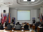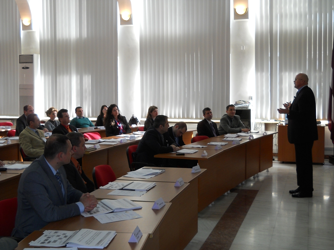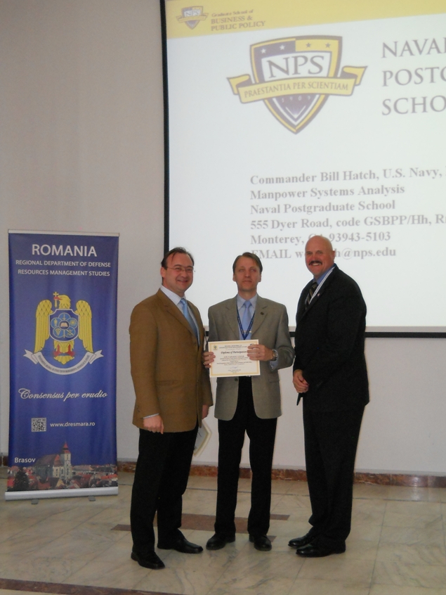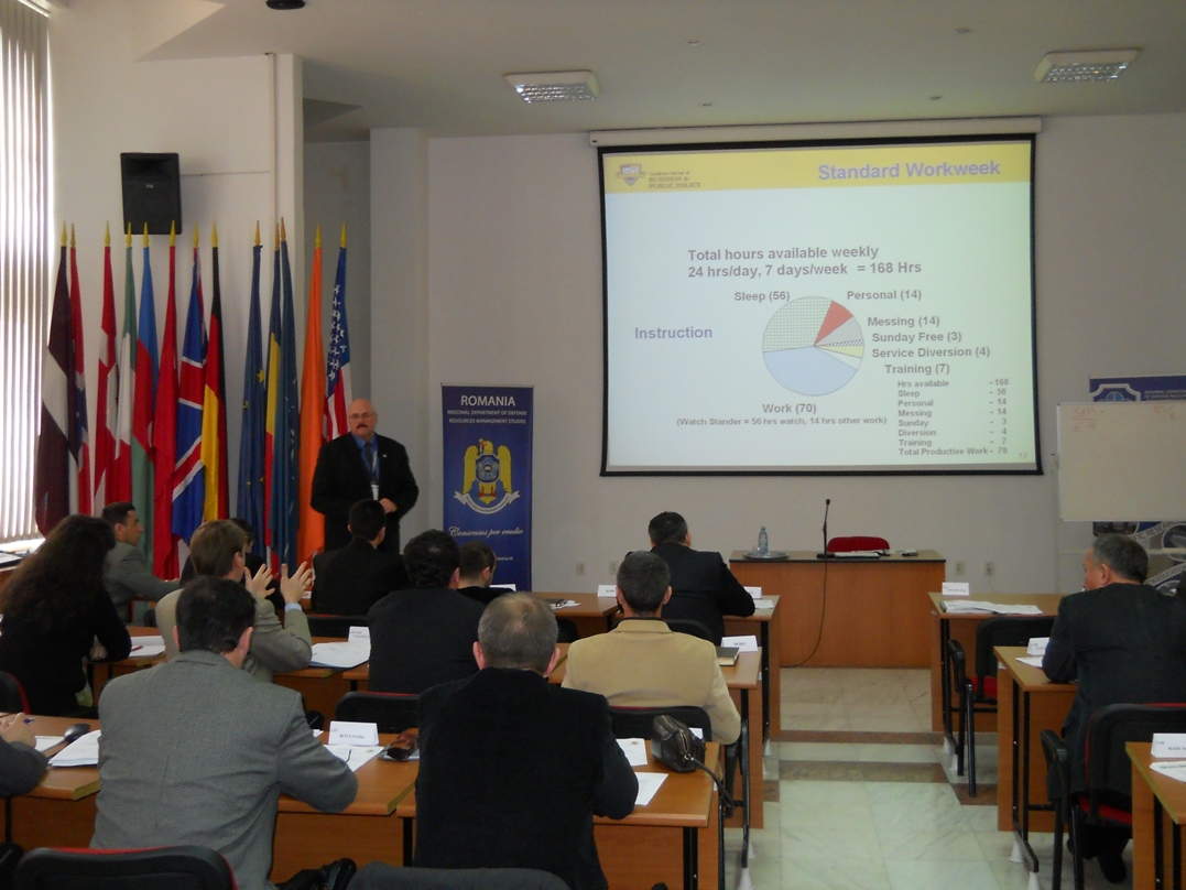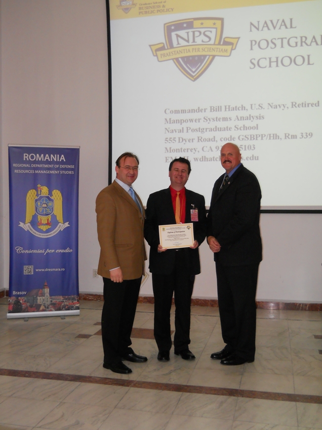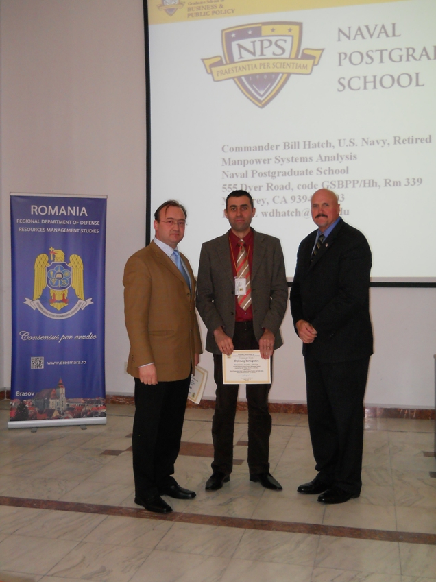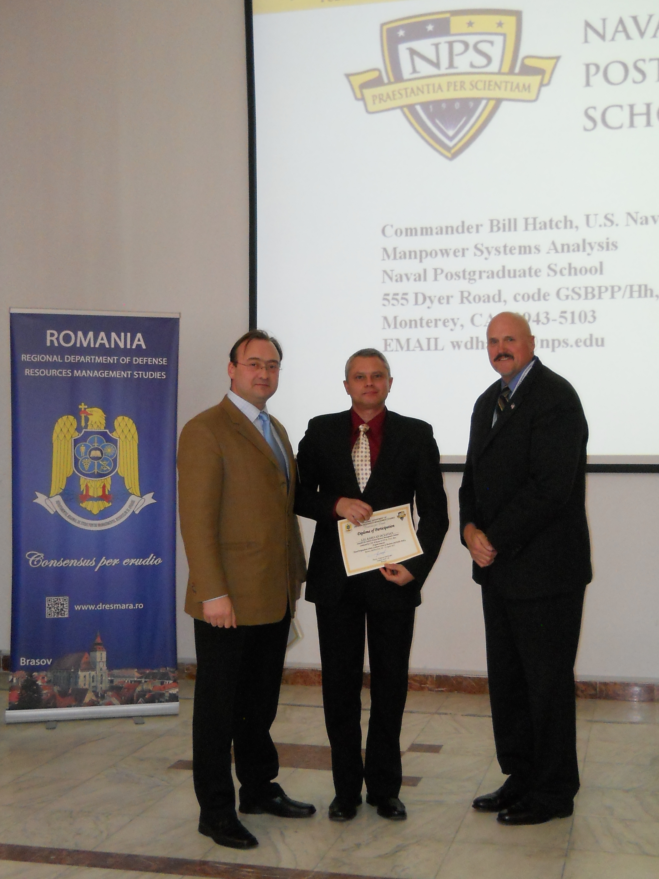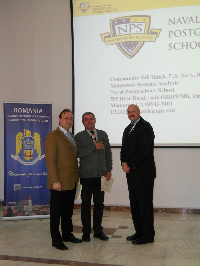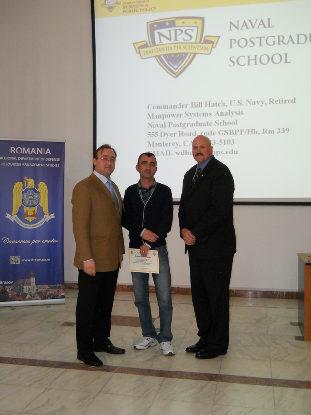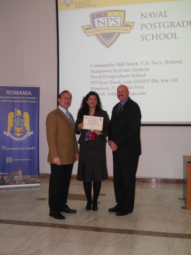 În perioada 10-12 aprilie 2013, DRESMARA a organizat în colaborare cu Şcoala Universitară de Afaceri şi Administraţie din cadrul Şcolii Navale de Studii Postuniversitare (NPS) de la Monterey – Statele Unite ale Americii seminarul „Managementul resurselor umane în domeniul apărării”. Seminarul a fost susţinut de domnul Comandor (r) William HATCH, director de programe educaţionale la NPS. La activitate au participat ofiţerii - studenţi de la cursul postuniversitar de perfecţionare „Managementul resurselor de apărare pentru specialişti”, personalul didactic al departamentului, experţi în domeniul managementului resurselor umane din cadrul categoriilor de forţe ale Ministerului Apărării Naţionale, personal didactic din Universitatea Naţională de Apărare „Carol I” şi Academia Forţelor Aeriene „Henri Coandă”. |