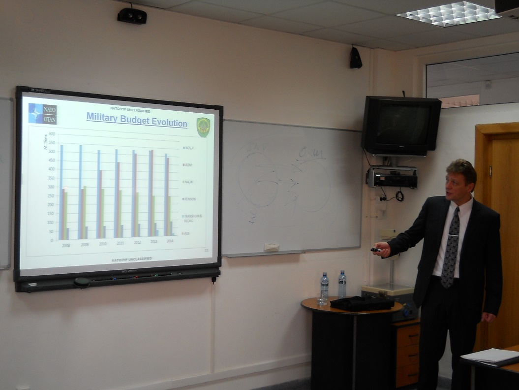 | În perioada 11 - 12 noiembrie 2014, domnul Nils BAARING, reprezentant al Secției Bugetare şi Politici al Comandamentului Aliat pentru Operaţii SHAPE - J8, Mons, Belgia a susținut al treilea seminar pe tema „Managementului resurselor financiare în NATO”. Invitatul a făcut o prezentare a resurselor NATO şi a managementului acestora, a fazelor de execuţie, bugetare şi programare a bugetului militar şi a explicat modul de finanţare a operaţiilor şi misiunilor NATO. La activitate au participat ofiţerii de la cursurile postuniversitare de formare şi dezvoltare profesională continuă în domeniile „Managementul resurselor de apărare pentru personalul de conducere” - ACT 477.2, și „Managementul resurselor informaționale pentru personalul de conducere” - ACT 478.1, precum și personalul didactic din Departamentul Managementul Resurselor de Apărare. |