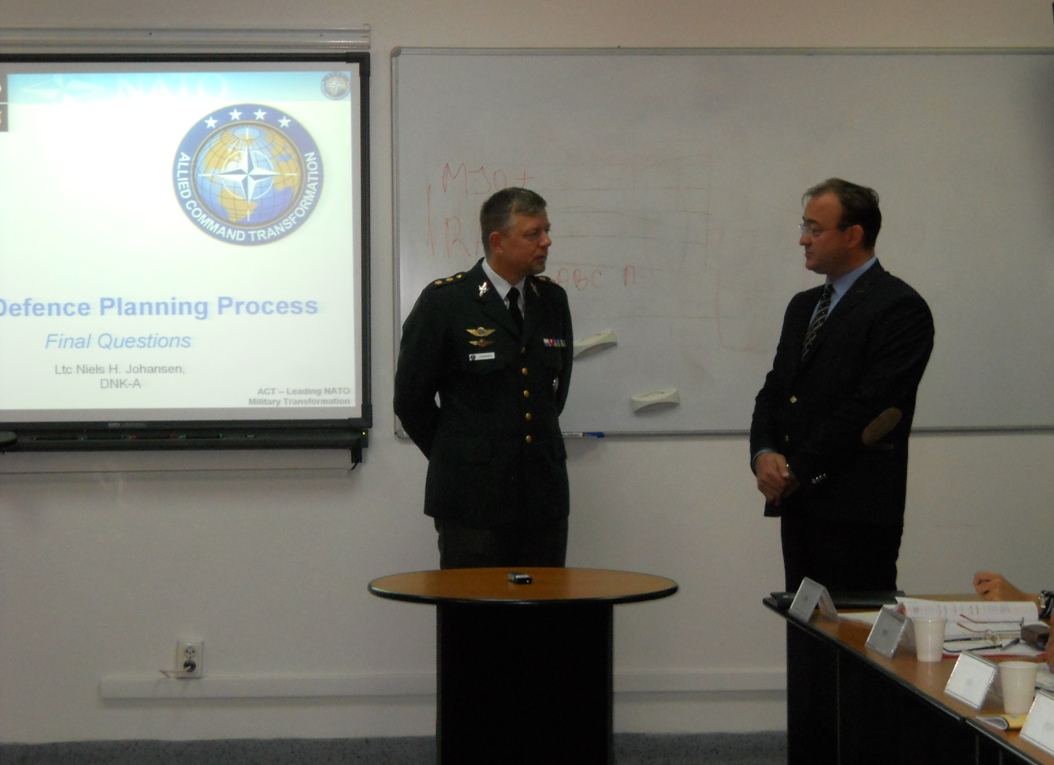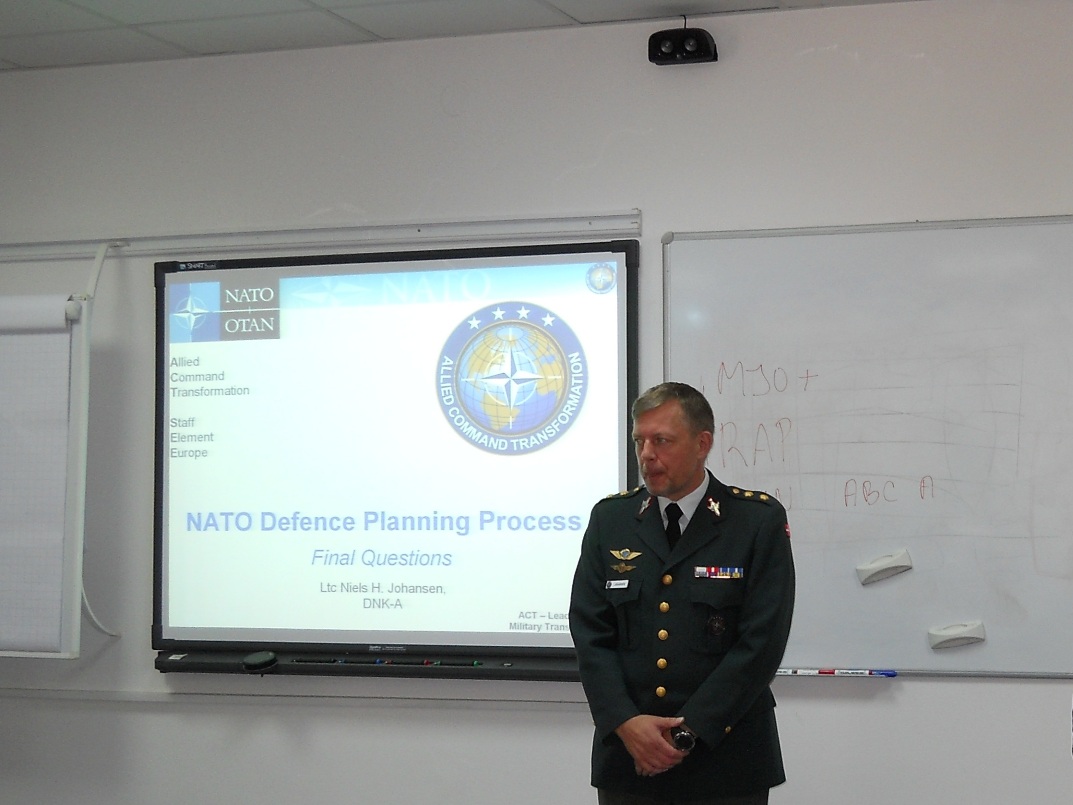| În perioada 21 - 22 octombrie 2014, domnul Locotenent-colonel Niels H. JOHANSEN din cadrul Comandamentului Aliat pentru Transformare - Structura de stat major pentru Europa, Mons, Belgia, a susţinut cea de-a șasea iteraţie a seminarului cu tema „Procesul de planificare a apărării în NATO”. Invitatul a analizat procesul de planificare a resurselor în NATO şi schimbările generate de mediul actual de securitate. La activitate au participat ofiţerii de la cursurile postuniversitare de formare şi dezvoltare profesională continuă în domeniile „Managementul resurselor de apărare pentru personalul de conducere” (ACT 477.2) și „Managementul resurselor informaționale pentru personalul de conducere” (ACT 478.1) organizat de DRESMARA. |