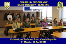 În perioada 31 martie – 02 aprilie 2015, Conf.univ. dr. Maria CONSTANTINESCU a desfășurat activități didactice în cadrul programului ERASMUS - mobilităţi pentru personalul didactic, la Universitatea Națională de Apărare, Brno, din Republica Cehă. Activitatea a avut ca scop principal împărtăşirea experienţei româneşti în domeniul studiului managementului resurselor de apărare cu personalul didactic al Facultăţii de leadership militar şi studenţii participanţi în programele educaţionale specifice. Reprezentantul DRESMARA a prezentat activitatea departamentului şi a purtat discuţii cu partenerii cehi în scopul identificării de noi experienţe, schimbului de bune practici în domeniul planificării, organizării și desfășurării cursurilor şi extinderii cooperării privind cercetarea ştiinţică. |