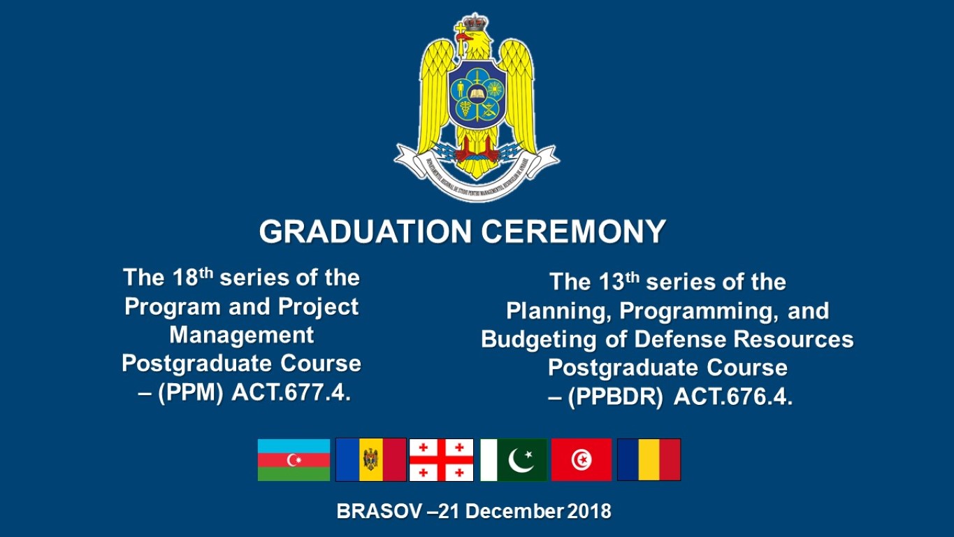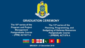 În data de 21.12.2018 a avut loc ceremonia de absolvire a celei de-a 18-a serii a cursului postuniversitar de formare și dezvoltare profesională continuă „Managementul Proiectelor și Programelor” – ACT 677.4. și a celei de-a 13-a serii a cursului postuniversitar de formare și dezvoltare profesională continuă „Planificarea, Programarea și Bugetarea Resurselor de Apărare” – ACT 676.4.