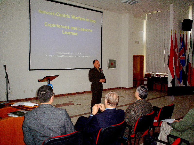 În data de 16.10.2006 domnul Jack Treddenic şi domnul colonel James Howcroft, profesori la Centrul European de Studii de Securitate "George C. Marshall", Garmisch-Partenkirchen, Germania, au susţinut prelegeri în cadrul celor trei cursuri de management aflate în desfăşurare la Departamentul Regional de Studii pentru Mangementul Resurselor de Apărare. Principalele teme dezbătute în cadrul acestor prelegeri au fost: "Economics of Defense Planning and Budgeting", "Defense Transformation: Concepts and Affordability" şi "Network-Centric Warfare in Iraq - Experiences and Lessons Learned". |