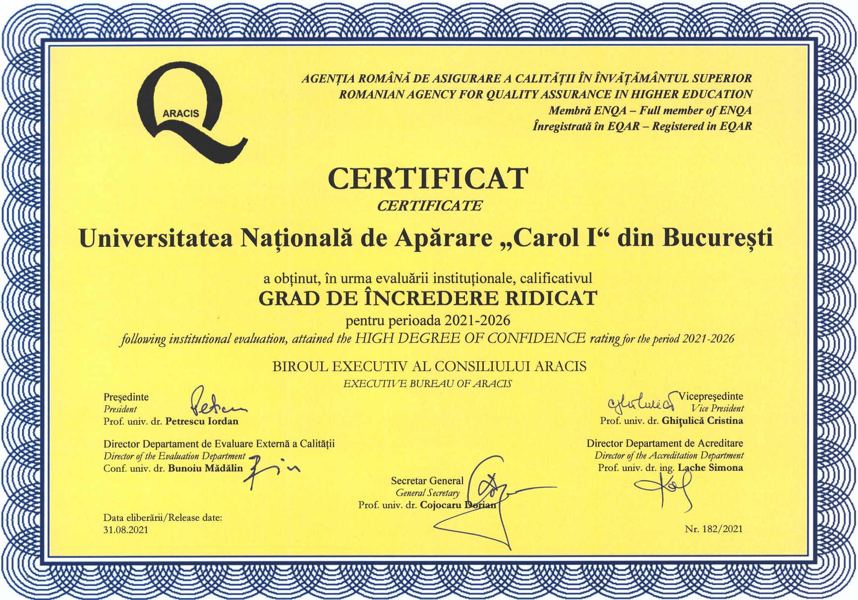 Instituţia organizatoare (Universitatea Naţionala de Apărare „Carol I” prin Departamentul Regional de Studii pentru Managementul Resurselor de Apărare Braşov) este clasificată ca Universitate de educaţie şi cercetare ştiinţifică Monitorul Oficial nr. 637 din 06 septembrie 2011 și Hotărârea nr. 129 din 29.10.2015).