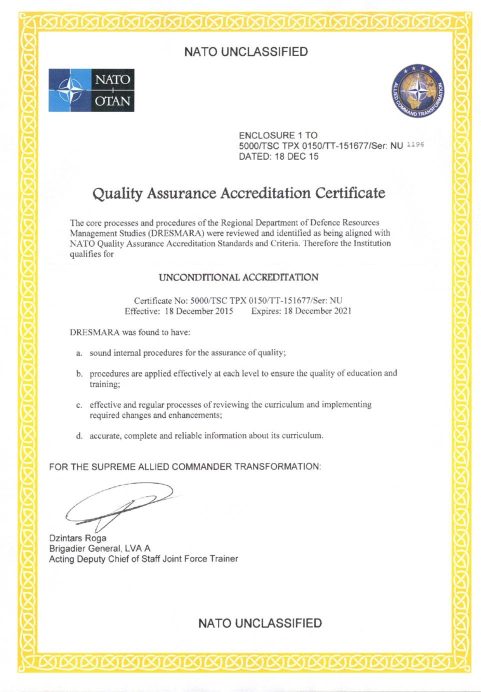În data de 18.12.2015, DRESMARA a primit, pentru prima dată, Certificatul de Asigurarea Calității în învățământul NATO, din partea Structurii de Instruire Întrunită a Forței, din cadrul Comandamentul Aliat pentru Transformare, ca recunoaștere a contribuției deosebite adusă asigurării calității în procesul de Educație și Instruire din NATO. Prin eforturi susținute DRESMARA și-a stabilit ca obiectiv prioritar și permanent instituirea tuturor condițiilor necesare îmbunătățirii calității educației și formării profesionale individuale, planificând judicios și eficient toate activitățile. Procesele și procedurile de bază ale DRESMARA au fost identificate, analizate și organizate, pentru alinierea la Standardele și Criteriile de Asigurarea Calității în învățământul NATO. Astfel, DRESMARA a îndeplinit cerințele de acreditare, având: