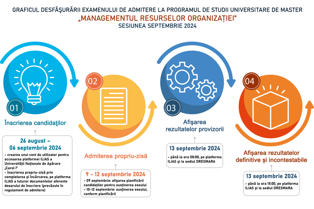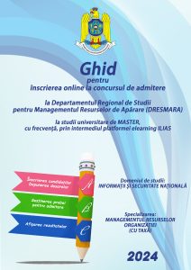 Fiecare candidat are obligația ca, înainte de înscriere, să ia la cunoștință prevederile Regulamentului de organizare și desfășurare a admiterii la studii universitare de master în Universitatea Națională de Apărare „Carol I”, în anul universitar 2024-2025, fapt ce urmează a fi asumat prin semnarea cererii de înscriere.