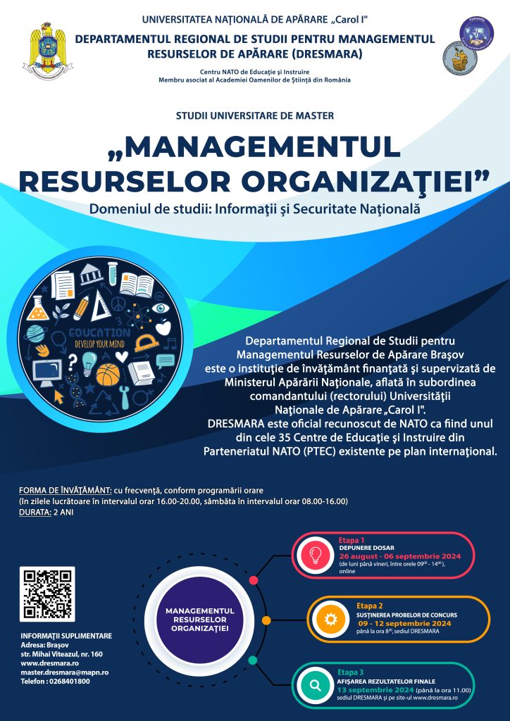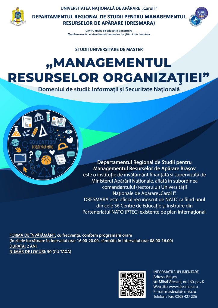 Programul de studii universitare de master „Managementul resurselor organizației” este validat de Autoritatea Națională pentru Calificări (ANC) și este înregistrat în Registrul Național al Calificărilor din Învățământul Superior (RNCIS), conform notificărilor ANC nr. 4061 din 26.03.2018 ȘI NR. 3139 DIN 29.03.2023.